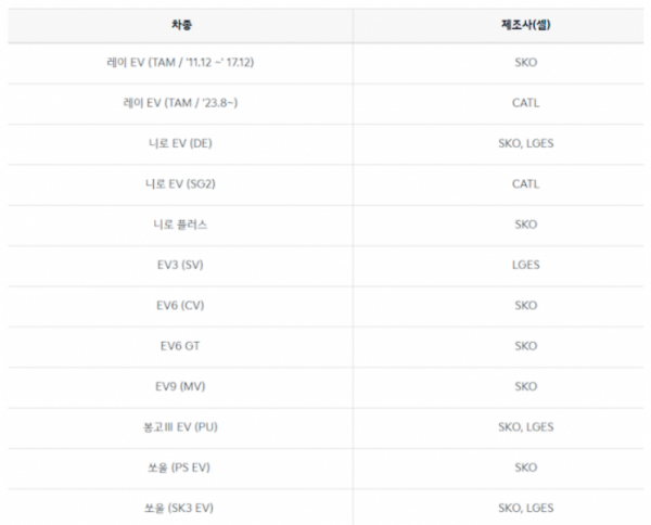 기아는 이날 홈페이지를 통해 12종 전기차에 탑재된 배터리 제조사를 게시했다. 10종은 국내 배터리 제조사인 SK온과 LG에너지솔루션 제품을 사용하고 있다. 레이EV와 니로EV에만 중국 1위 배터리 제조사인 CATL 제품이 들어간다.