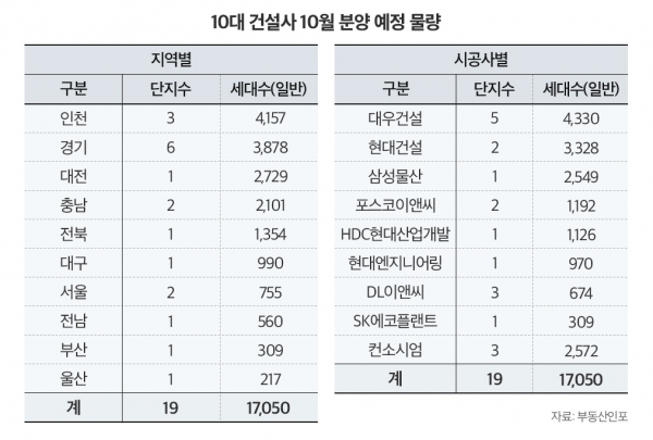24일 부동산시장 조사업체 부동산인포에 따르면 10월 한 달 동안 2024년 시공능력평가 10위 내 건설사의 시공단지는 총 1만7050가구(컨소시엄 포함)가 일반 분양할 예정이다. 올해 들어 지난 8월까지 총 5만7253가구, 월 평균 7156가구 분양에 그쳤던 것에 비해 기간 대비 많은 물량이 집중된 셈이다.