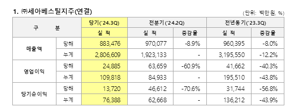 [서울파이낸스 김수현 기자]세아베스틸지주는 공시를 통해 2024년 3분기 연결기준 매출액 8835억원, 영업이익 249억원을 기록했다고 31일 밝혔다. 이는 전년동기 대비 각각 8.0%, 40.3% 감소한 수치다.
