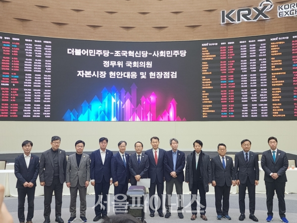 [서울파이낸스 박조아 기자] 더불어민주당·조국혁신당·사회민주당 등 야 3당 정무위원회 의원들은 10일 서울 여의도 한국거래소를 찾아 비상계엄 및 탄핵 정국에 대한 긴급 현안대응 및 현장점검에 나섰다.
