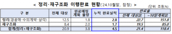정리·재구조화 대상(20조9000억원) 중 주거시설 관련 사업장은 총 10조9000억원이며, 이 중 10월말까지 2조8000억원(122개 사업장)이 정리·재구조화가 완료됐다. 아파트 사업장 1조3000억원, 비(非)아파트 1조5000억원을 정리·재구조화해 약 3만5000호(아파트 1만9000호, 비아파트 1만6000호)에 상당하는 주택공급 촉진에 기여했다.