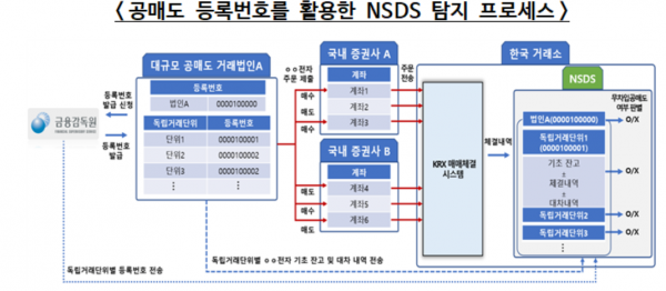 공매도 중앙점검시스템(NSDS)은 공매도 등록번호를 발급받은 투자자의 모든 주문을 등록번호별로 집계해 여러 증권사와 계좌를 이용하는 경우에도 거래정보를 취합, 무차입공매도 여부를 상시 탐지한다.