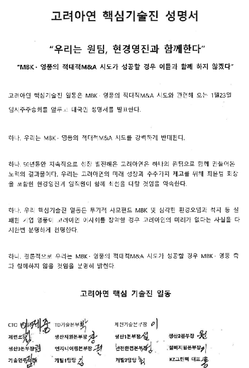 성명서에는 "투기적 사모펀드 MBK와 심각한 환경오염 및 적자 등에 시달리며 실패한 기업 영풍이 고려아연 이사회를 장악할 경우 고려아연은 미래가 없다"고 말했다. 또한 이들은 "우리는 MBK·영풍의 적대적 M&A 시도를 강력하게 반대한다"며 "MBK·영풍의 적대적 M&A 시도가 성공할 경우 MBK·영풍 측과 함께하지 않을 것"이라고 지적했다.