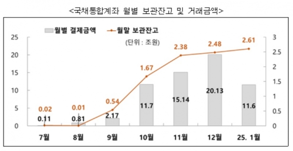 국채통합계좌는 국제예탁결제기구(ICSD)가 외국인 투자자를 위해 지난해 6월 말 국내 유일 전자등록기관인 예탁결제원에 개설한 계좌다. 해당 계좌의 이용 규모는 FTSE Russell이 한국 국채의 세계국채지수(WGBI) 편입을 발표한 지난해 10월부터 증가했다. 특히, 같은해 12월에는 외국인 투자자 간 역외거래의 확대로 월간 기준으로 처음으로 20조원을 넘어서기도 했다.