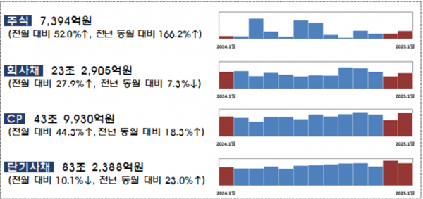 1월 중 회사채 발행 규모는 23조 2905억원으로 전월(18조2121억원) 대비 5조784억원(27.9%) 증가했다. 일반회사채는 62건, 8조4010억원으로 전월(17건, 1조5586억원) 대비 6조8424억원(439.0%) 늘었다.