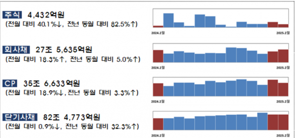 주식은 중소형 기업공개와 유상증자 위주로 진행돼 전월 대비 감소했지만 회사채가 기준금리 인하에 대한 기대감과 연초효과 영향으로 증가했기 때문이다.