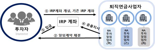 기존에는 IRP 가입자가 직접 적립금 운용을 지시해야 했지만, 퇴직연금 RA 서비스에 가입하면 투자일임업자의 로보어드바이저가 가입자를 대신해 운용을 지시한다. RA는 로봇(Robot)과 조언자(Advisor)의 합성어로 알고리즘을 통해 투자자 성향에 맞는 맞춤형 포트폴리오를 자동 생성하고 그에 따른 운용을 지시하는 서비스다.