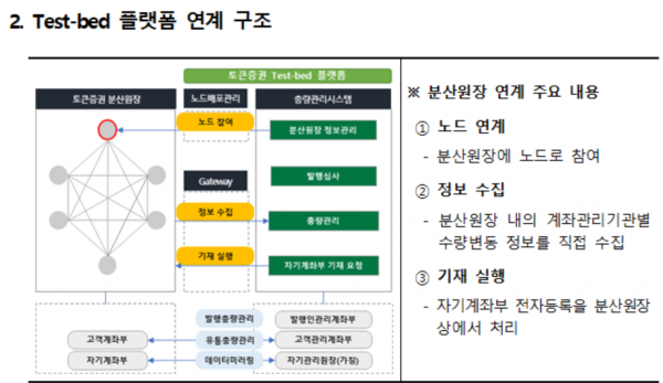예탁원은 분산원장에 기록된 거래정보를 수집해 토큰증권의 발행총량과 유통총량을 상시 일치하도록 관리해 투자자를 보호해야 한다. 예탁원은 이러한 역할을 수행하기 위해 관련 기능과 인프라를 테스트 환경에 구현하고, 이를 시장 참가자들과 함께 검증하기 위해 지난해 10월부터 8개월간 '토큰증권 테스트베드 플랫폼 구축 사업'을 진행했다.
